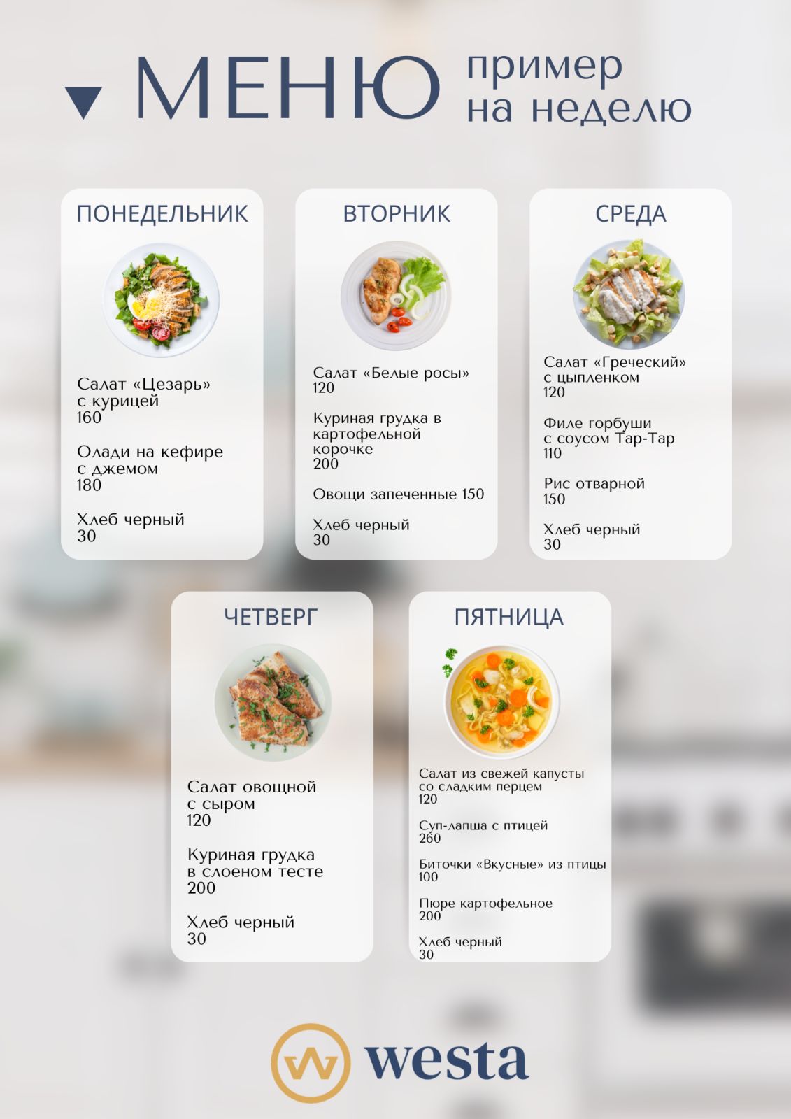У стандартны абедзенны комплекс уваходзяць супы, салаты, другія стравы, гарніры і хлеб. Таксама даступныя да замовы кандытарскія вырабы і выпечка ад уласнай кандытарскай «Веста», вегетарыянскія і посныя стравы.